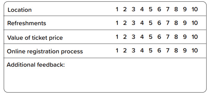 - Only ask about things you know you can change that will truly improve your event. If you’re not going to act on the feedback, there’s no reason to spend time asking the questions.