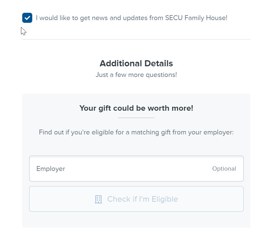 - Donor eligibility. This is simply to confirm if the person making the gift can have their donation matched. Whether the employer will match the gift or they’re giving to an official matching gift campaign are factors to consider for eligibility.