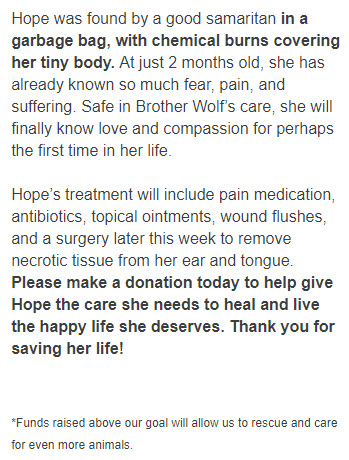 When your organization offers a solution to the problems you try to solve, be sure donors know what they’re giving to when you make your appeal. Being transparent about the cost of Hope’s treatment on their campaign page showed donors exactly what was needed. Setting a treatment goal for Hope helped supporters visualize how much would be needed. You can emulate Brother Wolf Animal Rescue’s transparency by using a fundraising thermometer. Set it to the amount you need to fix the problem you’re addressing. But, don’t stop there! Next you have to tell donors why you set that specific goal amount. What are their donations going to accomplish? In the case of Hope the puppy, Brother Wolf shared that they needed money for pain medication, her surgery, and round-the-clock care Hope would need if she was going to survive.