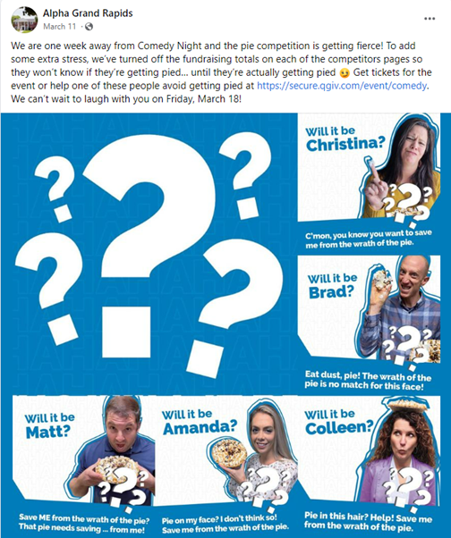 Alpha Grand Rapids did a great job promoting the competition on social media and coaching participants to highlight their pleas to be spared from a pie in the face on their personal fundraising pages!
