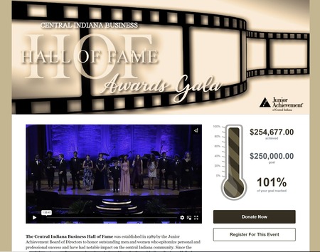 Junior Achievement of Central Indiana Business Hall of Fame 2021 event registration page with 101% completed fundraising thermometer