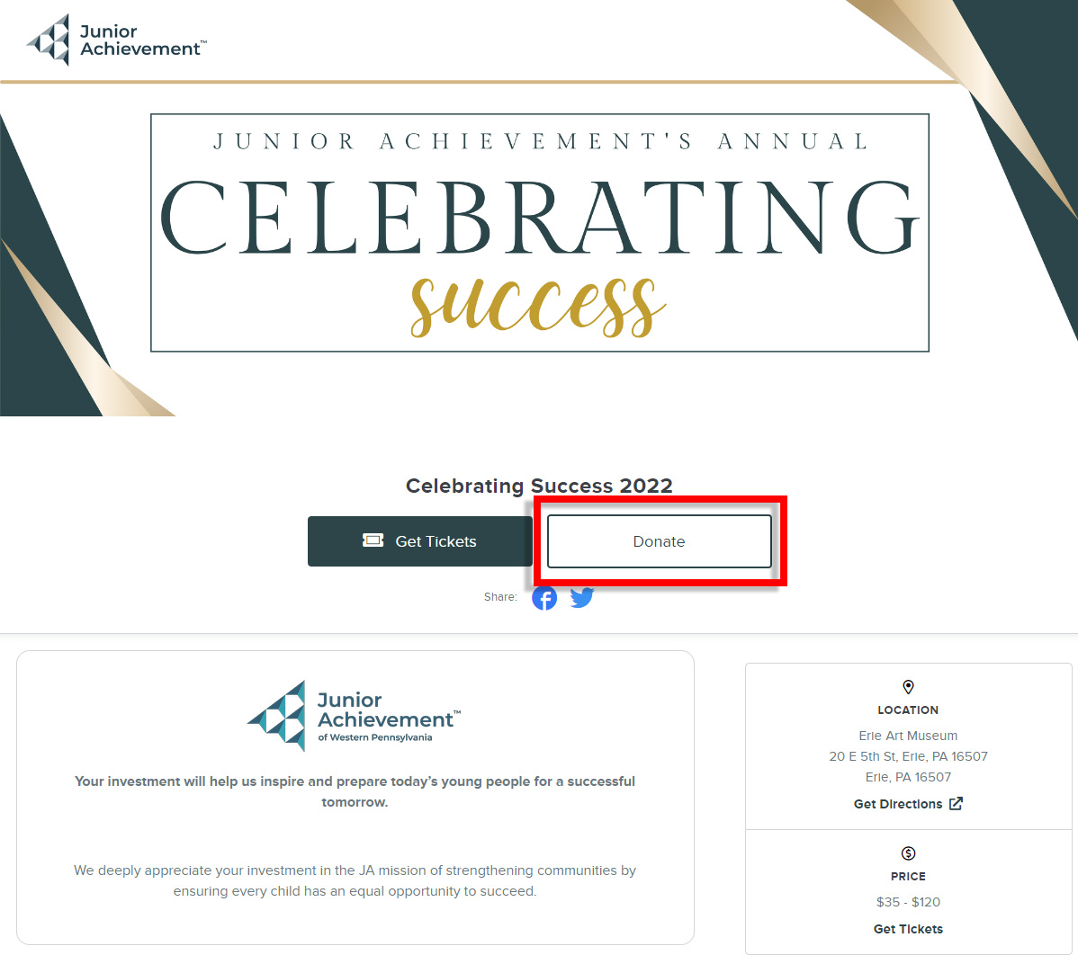 Junior Achievement of Western PA’s Celebrating Success Event Form with Get Tickets and Donate buttons, links to social media, About section, location and price info