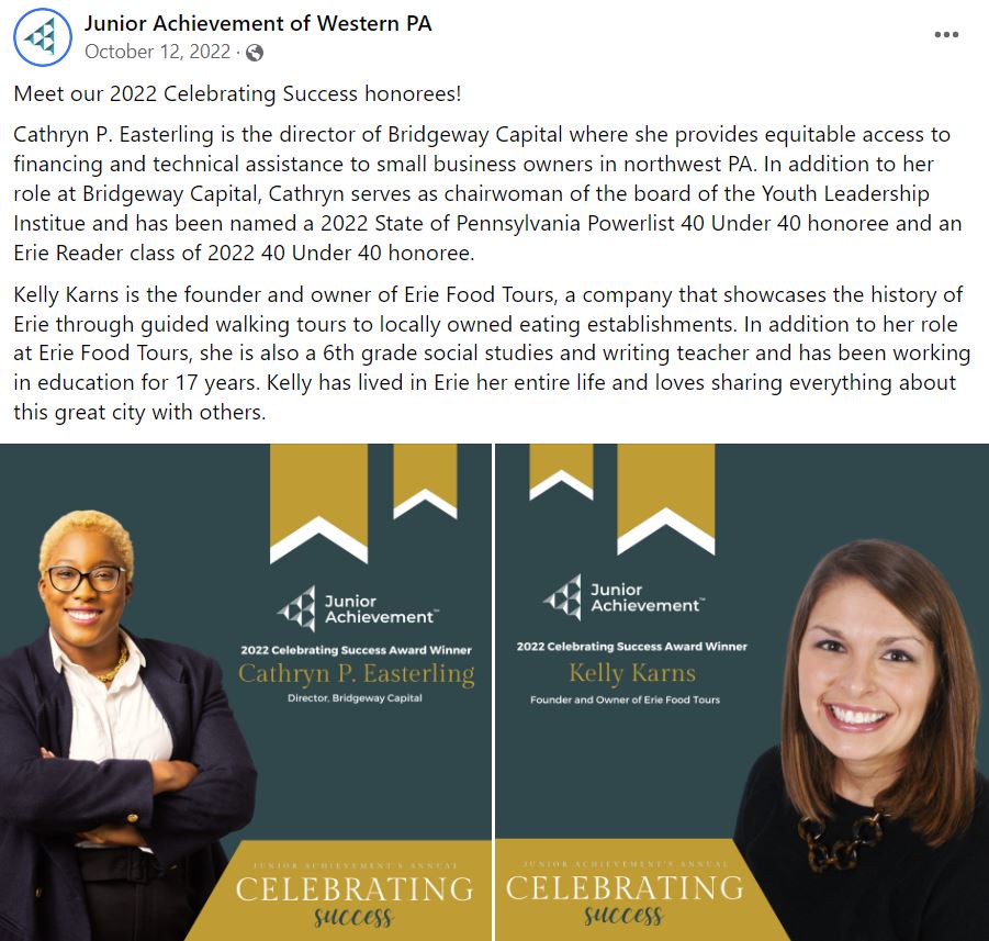 Junior Achievement of Western PA’s first social media announcement along with the event specific Facebook event page.  Text: "Congratulations to Cathryn Easterling, Erie Office Director at Bridgeway Capital and Kelly Karns, owner Erie Food Tours, for being selected as our 2022 Celebrating Success honorees! Please join us at our annual Celebrating Success event on November 9 at the Erie Art Museum to help us recognize Cathryn and Kelly's hard work and devotion to the economic and civil well-being of the Erie County region. Follow the link to secure your spot today."