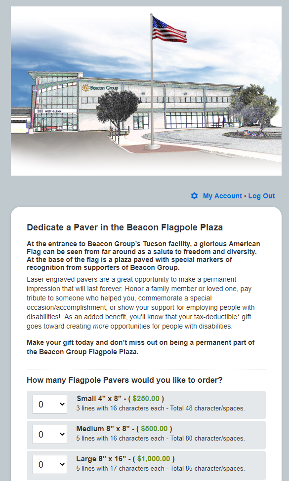 In the example below, the Beacon Group is using a Qgiv event form to offer engraved pavers around their flagpole plaza. They mention purchasing these in honor of a family member or someone who has helped the donor, and even include impact information about what the donation can do.